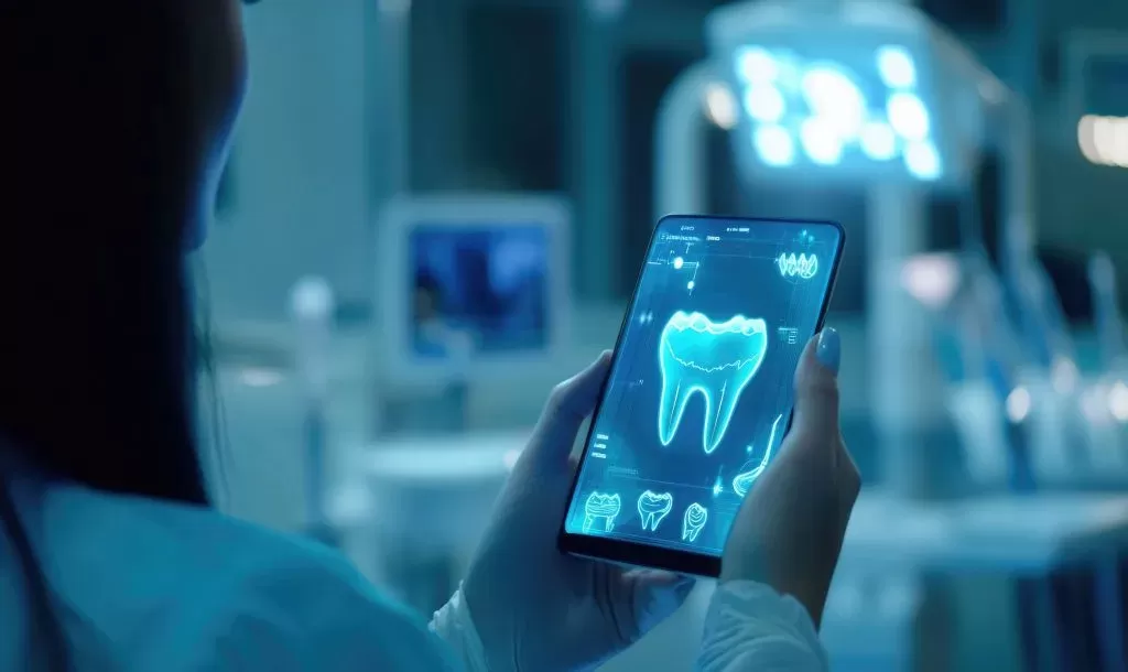 Dental innovation: dentist utilizing digital tools for internet consultations, bookings, integrating technology in dental treatments with 3D modeling,...